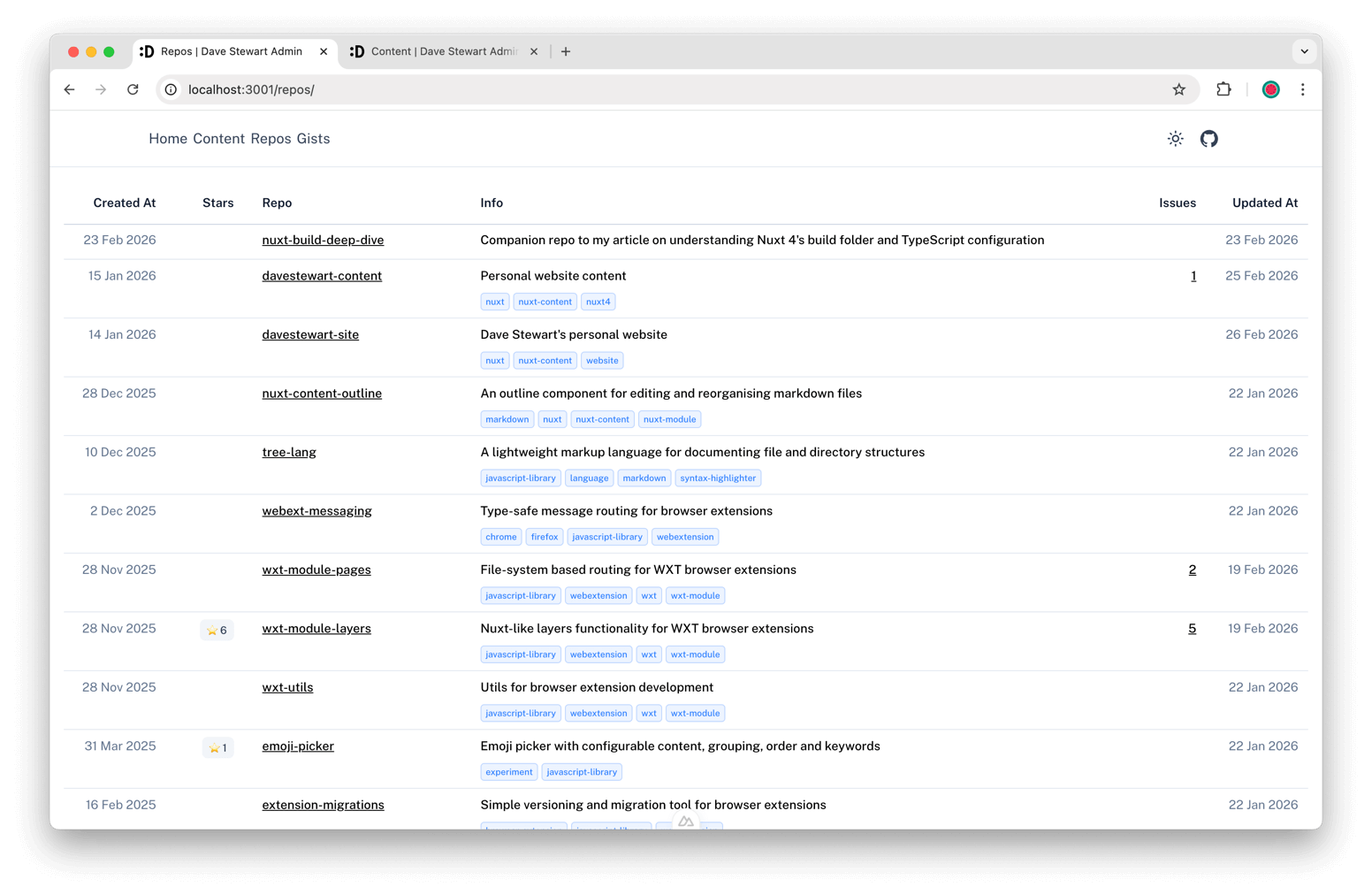 I'm also tinkering with an admin system for the site. This aims to store additional content metadata I might use, such as GitHub repo metadata, a content editor, etc: